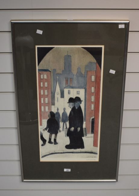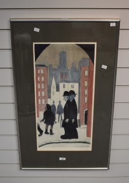 After Laurence Stephen Lowry RBA, RA (British 1887-1976) a Fine Art Trade Guild colour lithographic print 'The Two Brothers' signed in pencil to margin along with FATG ALC blindstamp, within a card mount and slender silver coloured frame, under glass 62.5cm x 31.5cm & 88cm x 54cm overall.