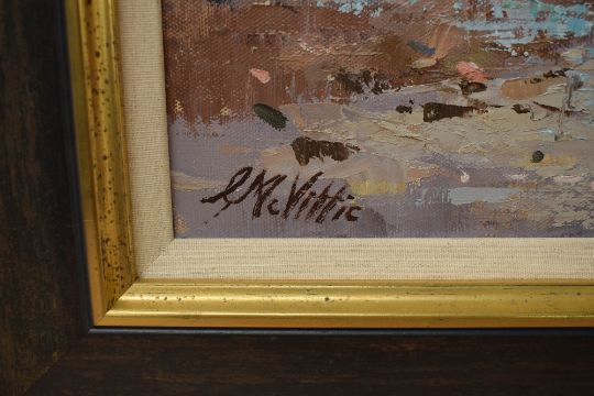 *Local Interest* G McVittie (British 20th century) Oil on canvas 'Haaf Netters Bowness on Solway', an impressionistic depiction of fishermen with traditional nets on the estuary, signed lower left, counter signed and titled verso, within canvas slip and moulded wooden frame, 49cm x 39cm & 69cm x 59cm overall.