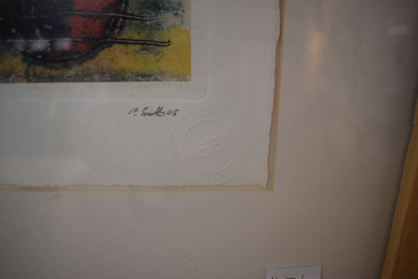Patrick Smith (British Contemporary) Mono print 'Metro City' a layered abstract composition in rich colours, signed in pencil to lower right margin titled centre and numbered (1/1) to left, 'Studio Fifty Eight' blind stamp lower right, within card mount and flat wooden frame, under glass 28cm x 38cm & 46cm x 59cm overall.