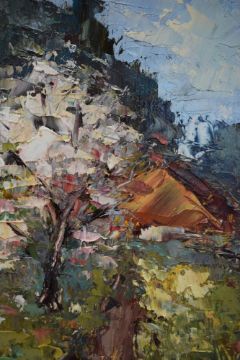 Valter Bezins (Latvian 1925-2009) Oil on board, a vibrant impressionistic impasto landscape depicting a blossom tree next to a house on a small lane, signed lower right, within moulded gilt frame, 19cm x 22cm & 33.5cm x 36.5cm overall.