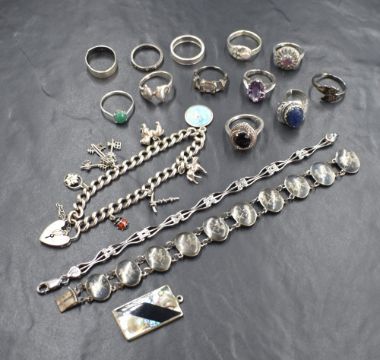 A selection of silver and white metal jewellery, most stamped 925/silver including Siam silver and enamel bracelet, charm bracelet, rings etc