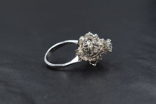 A white metal multi cluster stylised diamond ring stamped 750, the central raised diamond being approx 0.5ct within a triple diamond cluster with swirl channel set ribbon detail, total approx 1.75ct diamonds all in a claw set raised basket mount to knife blade shoulders on 18ct white gold loop, size M & approx 6.9g