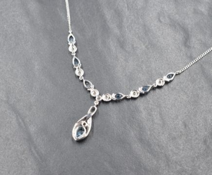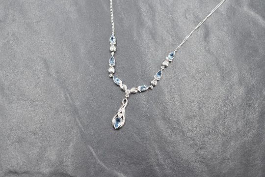 An 18ct white gold aquamarine and diamond set necklace, the six pear cut aquamarines alternating with six round brilliant cut diamonds, having a central round brilliant cut diamond with an articulated pear cut aquamarine and round brilliant cut diamond set infinity motif drop, all on a fine curb link chain, marked 750, 6.9g