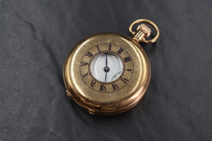 A 9ct gold top wound half hunter pocket watch having Arabic numeral dial with subsidiary seconds to white enamelled face in a classic 9ct gold half hunter case with blue enamelled Roman numeral outer dial, 92g gross, watch ticks when wound but not tested for functionality