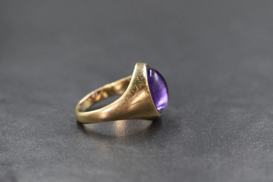A 9ct gold amethyst set signet style ring, the central oval amethyst in a bezel setting, marked 375, ring size P, 6g