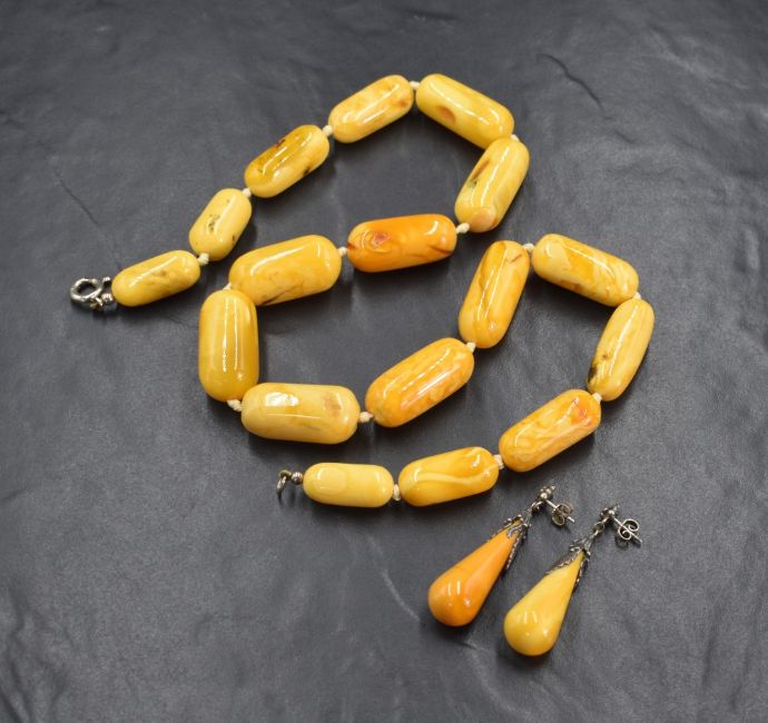 An egg yolk amber bead necklace having graduated cylindrical beads, on a white knotted cord, on a silver clasp marked 925, the beads measuring between approximately 3.5cm and 2.5cm, 61cm long, with a matched pair of tear-drop egg yolk amber earrings in decorative white metal mounts, measuring approximately 4cm, 86.3g gross