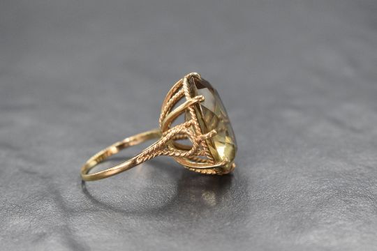 A yellow metal presumed gold smoky quartz set ring, the oval cut smoky quartz measuring approximately 20mm x 15mm in an openwork setting with rope detail, with rubbed hallmarks, ring size Q, 7.6g