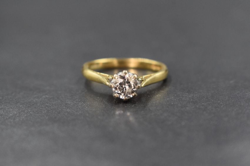 An 18ct gold diamond set solitaire ring, the round brilliant cut diamond measuring approximately 0.70ct in an eight claw surround, marked 750, ring size R-S, 4.2g. Fairly included under magnification