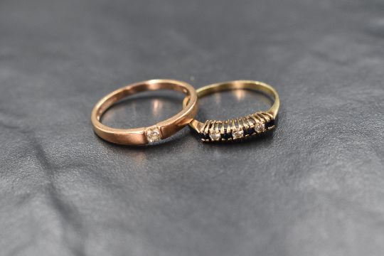 A 9ct rose gold diamond set band, the single round brilliant cut diamond in a pressure setting, marked 375, along with a 9ct gold sapphire and cubic zirconia set seven stone band, marked 375, ring sizes S and P respectively, 3.6g gross