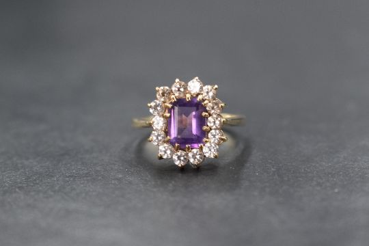 A 9ct gold amethyst and cubic zirconia cluster ring, having a baguette cut amethyst within a surround of CZ in a claw set mount to knife blade shoulders on a 9ct gold loop, size N & approx 3.1g