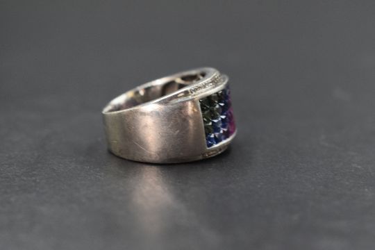 A silver band ring of broad form having an inset panel of 36 rainbow sapphires bordered by diamond strips, size R & 9.7g, two diamonds missing