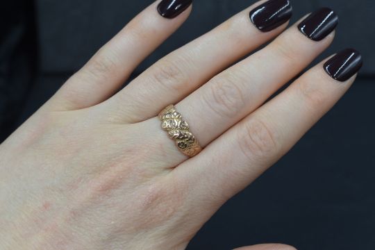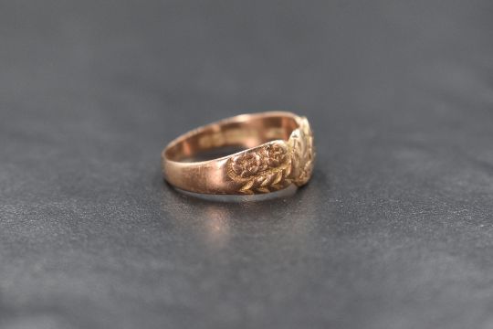 A Victorian 9ct rose gold Keeper ring, the band having a woven motif with floral decoration, marked 375, ring size O-P, 3g