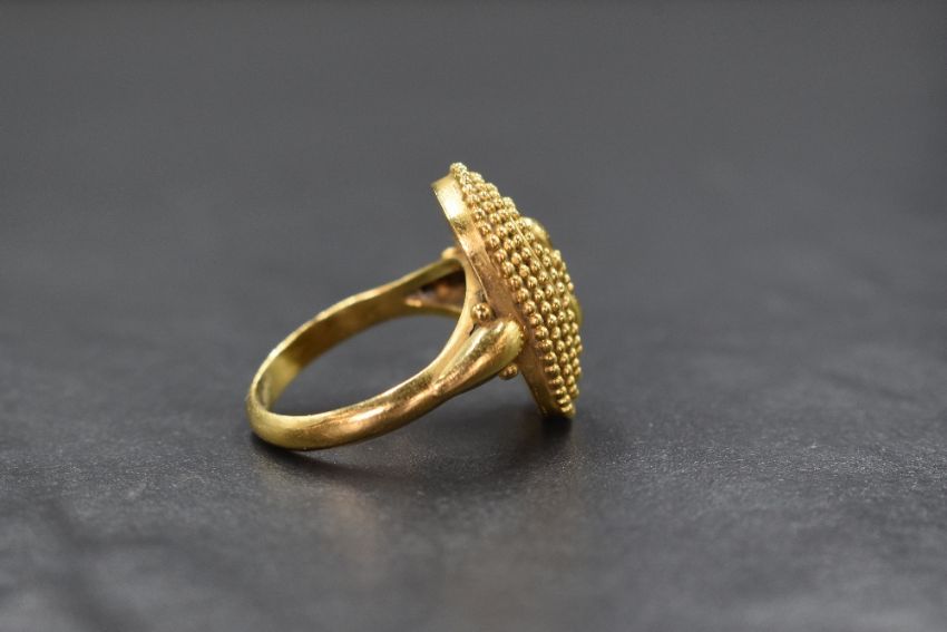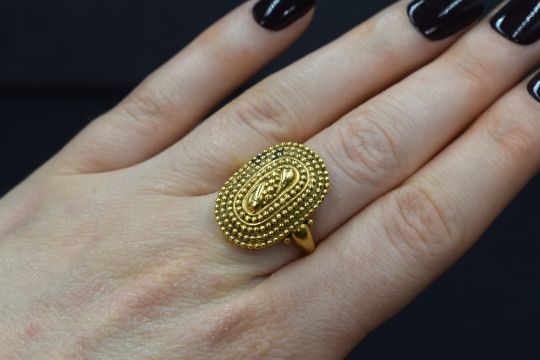 A 22ct gold ring, the oval form ring having two central teardrop motifs with four surrounding rows of beadwork, with decorative shoulders, marked K22, ring size R, 11.8g