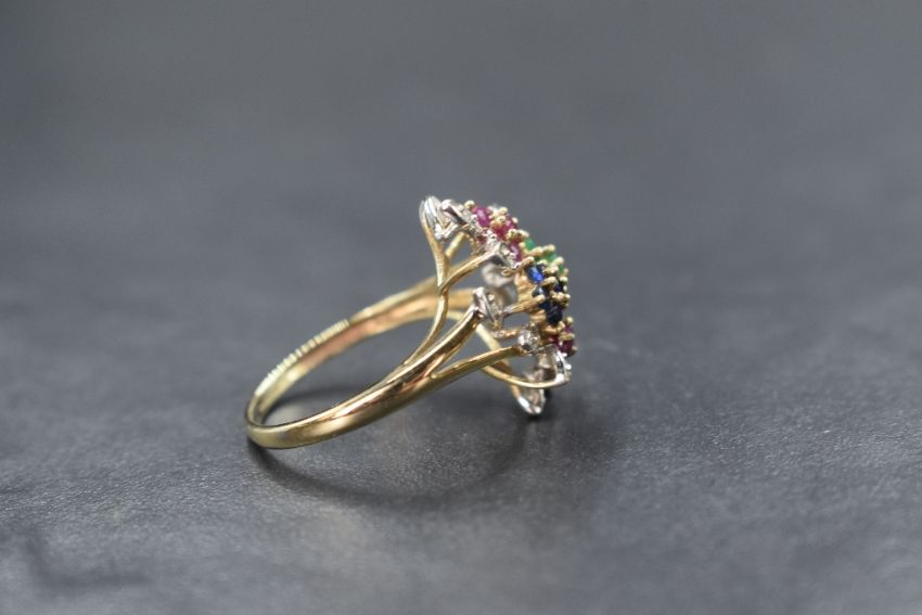 A 9ct gold multi cluster mixed gemstone ring in an open setting within a surround of diamond chip set petals to split shoulders on a 9ct gold loop, size P & 3.2g