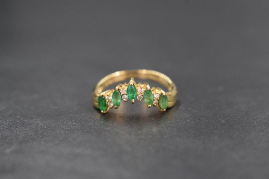An 18ct gold emerald and diamond wishbone ring, the five marquise cut emeralds, total approx 0.4ct, interspersed by four pairs of diamond chips, all in claw mounts on an 18ct gold loop, size M & approx 2.8g