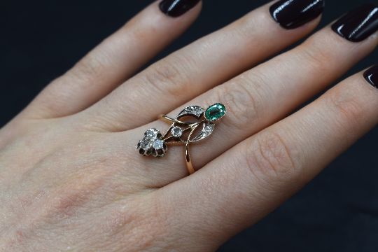 A yellow metal presumed gold emerald and diamond set Belle Epoque ring, the foliate motif setting having three old cut diamonds over a bezel set diamond and an oval cut emerald flanked by two diamond set scrolls, having rubbed hallmarks, ring size N, 3.8g