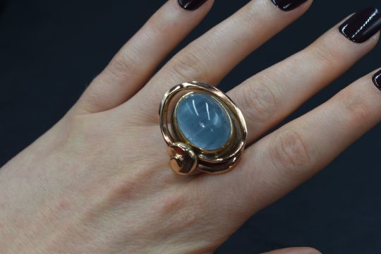 A silver and yellow metal blue cabochon possibly aquamarine set artisan ring, likely a scarf ring, the central bezel set cabochon with natural inclusion, in a yellow metal bezel setting with organic motif surround, on a silver shank, marked 925, 27.6g