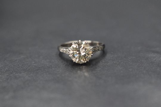 An 18ct white gold and platinum diamond set solitaire ring, the round brilliant cut diamond measuring 1.87ct in a ten claw setting, having three diamond chips set to each shoulder, marked 18ct Plat., ring size J, 3.5g. Large inclusion to table and throwing some colour