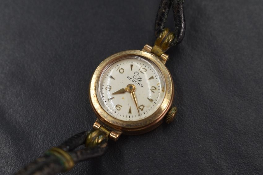 A ladies vintage 9ct gold wrist watch by Record having baton & Arabic numeral dial in a small circular case on a double cord strap, 10.3g gross