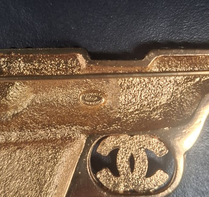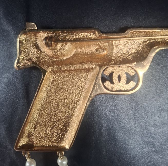 A vintage Chanel runway pistol brooch having the CC logo, onyx and rhinestone embellishment and faux pearl drop decoration, bearing Chanel logo plaque 01A en verso for 2001, approx 90mm long, with Chanel pouch & box