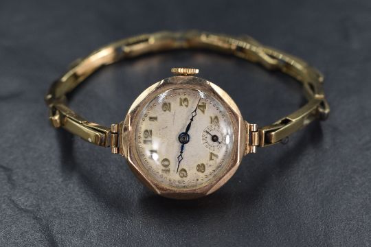 A ladies vintage rose gold wrist watch having Arabic numeral dial with subsidiary seconds on a circular face in an octagonal case, bearing hallmarks but too worn to read, on a stretch strap stamped 9ct, watch not working, gross weight 17.9g