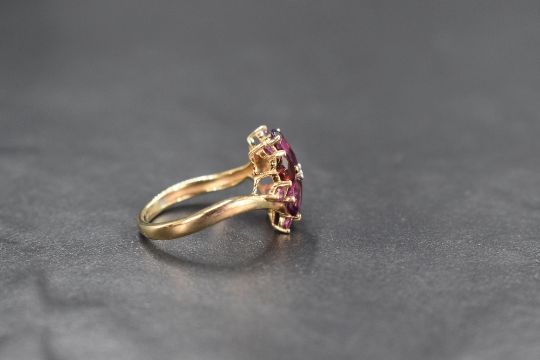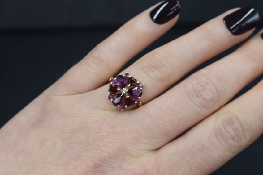 A 9ct gold garnet and amethyst open daisy cluster ring by QVC, having heart cut garnets interspersed by amethyst petals, all in a claw set mount on a 9ct gold loop, size M & approx 2.6g