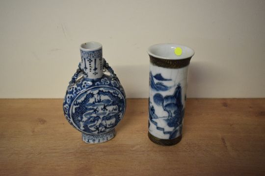 Two thought to be 19th-century Chinese blue and white porcelain pieces, comprising a moon flask with a flattened circular body decorated with a pair of dragons chasing a pearl, bordered with floral and foliate motifs and applied Chilong figures to the shoulders, together with a bitong brush pot of cylindrical form featuring a rural landscape scene and a crackle glaze finish, both unmarked, 17cm and 16cm, (2), no visible damages.