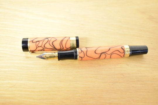 A boxed Sigma converter fill fountain pen in Orange Swirl having Iridium Point Germany nib