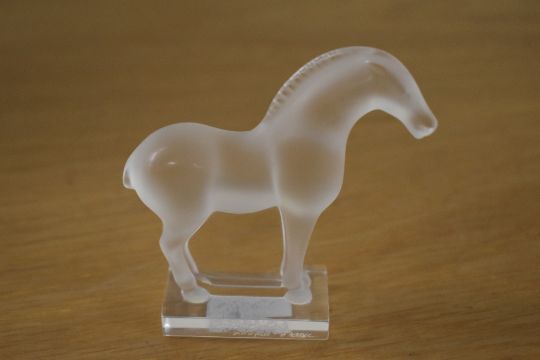 A 20th-century French Lalique frosted crystal 'Tang' horse figurine, featuring a delicately sculpted horse upon a square plinth, marked to base, 9cm, three small surface scratches to the front of the horse.