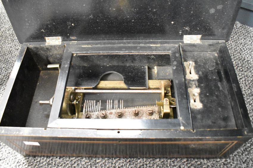A late 19th to early 20th-century cylinder music box, rosewood with inlaid decorative elements and raised upon four arched feet, 45cm diameter, visible damage and missing components consistent with condition described, in need of significant repair to the interior with parts contained in bags.