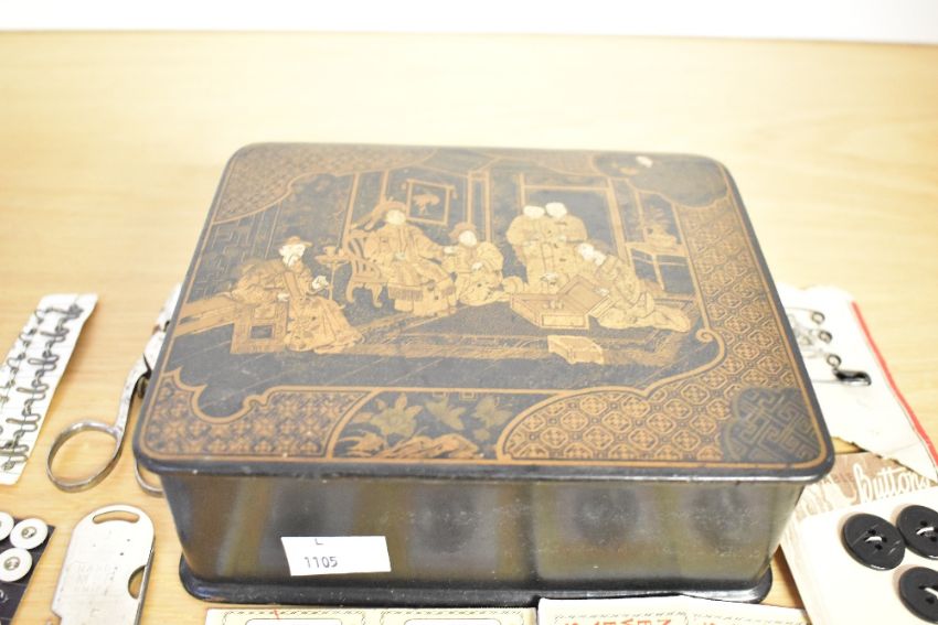 A 20th-century Chinese black lacquer and gilt decorated box filled with vintage sewing notions, 16cm, condition is consistent with age and wear.