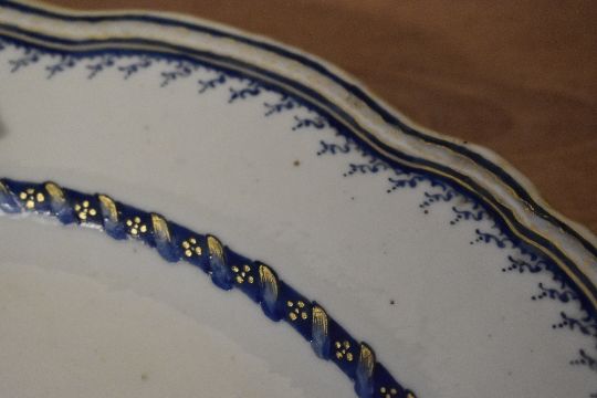 A Victorian Royal Doulton-style ceramic plate, featuring a blue floral pattern, with a scalloped rope-motif edge and gilded rim detailing, unmarked, 24cm