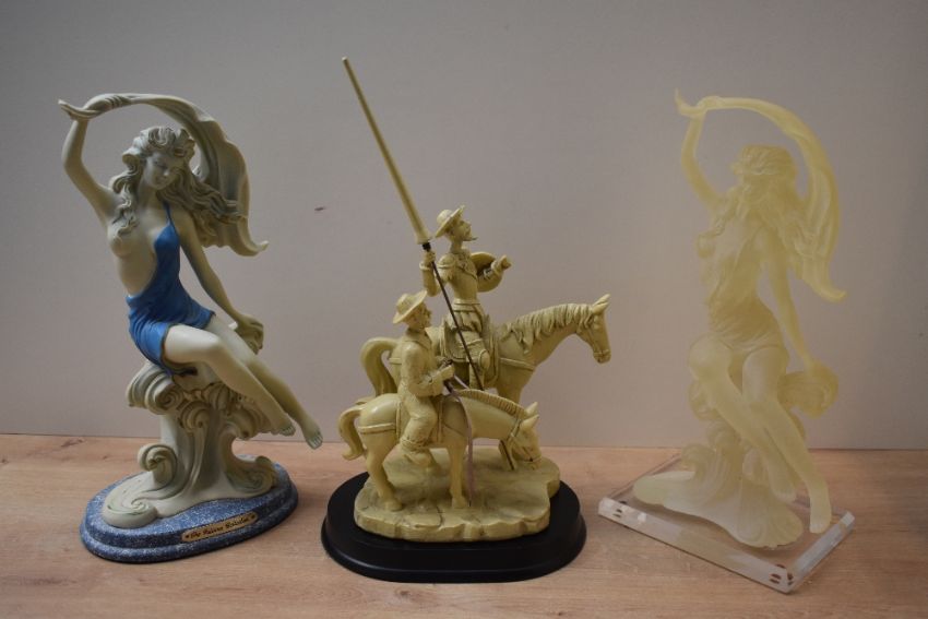 A resin figure group depicting Don Quixote and Sancho Panza, sold together with two Giuseppe Armani Florence collection figurines 'Wind Song' model number 0904C.