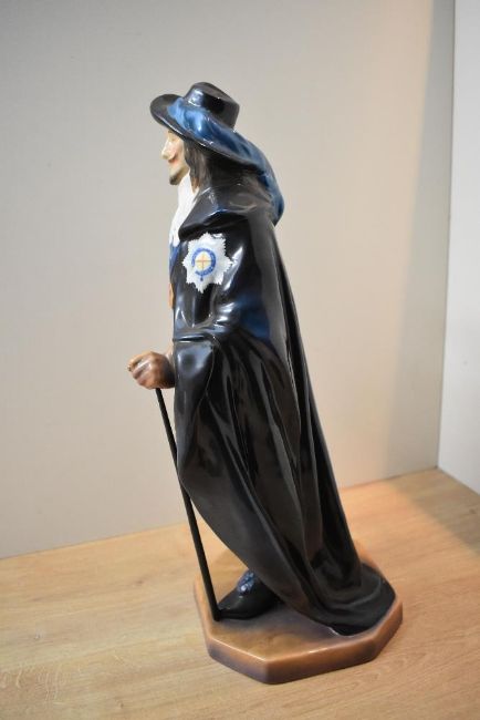 A large Royal Doulton bone china figure of King Charles, model number HN 2084 with date stamp 27.4.82 to underside and gilt signature, designed by Charles Noke and Harry Tittensor, modelled in Garter robes with wooden staff, measures 43cm tall.