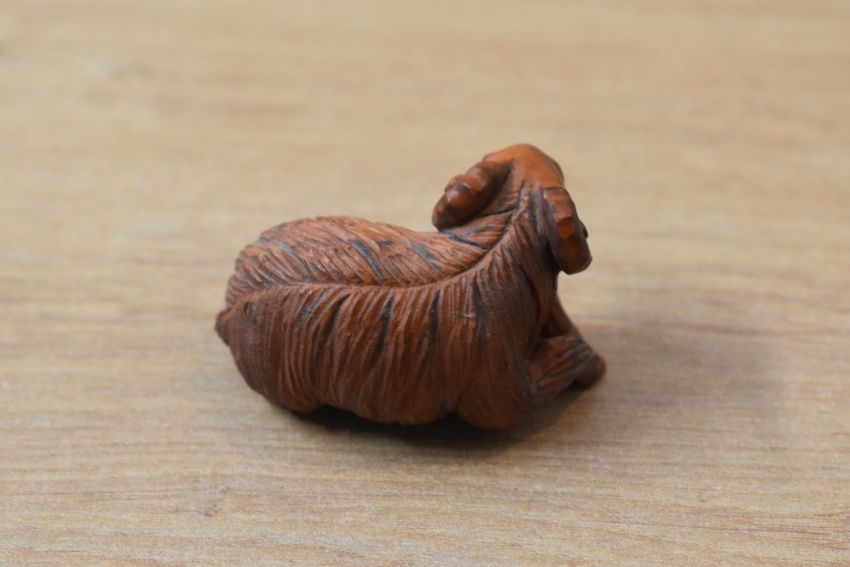 A small Japanese carved boxwood Netsuke Ram study, no visible markings or signature, measures 4cm tall.
