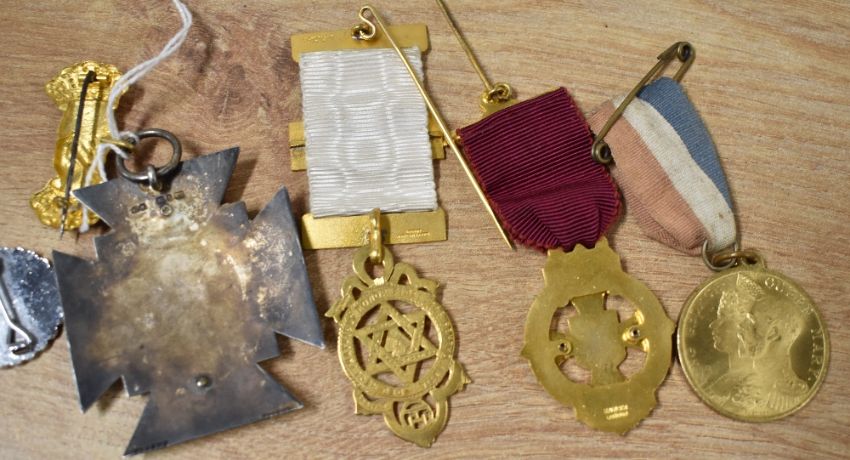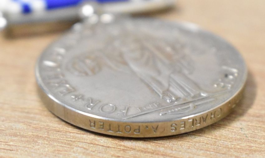 EII For Exemplary Police Service medal correctly impressed SERGT. CHARLES A. POTTER with ribbon and wearing pin, a WW1 Royal Marine Light Infantry Victory medal correctly impressed PLY. 1408 -8- PTE. V.T. WELLS. R.M.L.I. on original ribbon, a WW1 Victory medal without ribbon correctly impressed 382 SEPOY. NEK. MOHD. 2-107 PNRS. Online sources confirm that Victor Thaddeus WELLS was born in Derbyshire during 1896 and enlisted into the Royal Marine Light Infantry, Plymouth Division for Short Service on 16 February 1916. His Service Record can be downloaded from the National Archives website. Sold together with an embroidered 7 Light Cavalry King's Crown cloth badge, four WW2-period small embroidered unit badges, a WW2 ribbon bar on pin for 1939-45, Burma stars and Defence medal, two Union Jack cloth patches, a Royal Life Saving Society cloth patch, a German pin badge, a King George V and Queen Mary 1911 Coronation Borough of Nelson celebration medallion, a Manchester Unity Of Oddfellows metal badges, a 1909 Opening of the Town Hall Lancaster commemorative medal given by Lord Ashton to Mayor Robert Wilson, a 1874-1954 Sir Winston Churchill 80th Birthday commemorative medal, two Masonic medals, a Whitworth Memorial Medal and an unknown Chinese commemorative medal, these five in their boxes.(Lot)