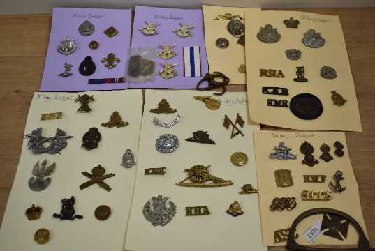 British Military Cavalry, Infantry and Corps cap and/or collar badges, mostly King's Crown types and comprising samples to 21st (Empress of India's) Lancers, 5th Border Cumberland Regiment, Border Regiment, Princess of Wales's Royal Regiment PWRR, Royal West Kents, Machine Gun Corps, bakelite Royal Corps of Signals, Queen's Own Cameron Highlanders, several types of Royal Artillery etc, shoulder titles for K.A.R. RMR RAOC RHA RWF RCCS RWF etc, several buttons, pin badges, medal ribbons, Commemorative pieces, a bullion embroidered Merchant Navy cap bade and foreign badges - some damage, missing lugs, pins and fixings, original and reproduction seen, all mounted on seven cards.(Lot)