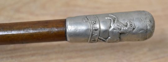 Military Swagger Sticks with white metal pommel on metal-tipped wooden cane, overall 70cm, one featuring the Regimental badge of the King's (Liverpool Regiment), one featuring the King's Crown and Regimental badge of the Royal Army Service Corps. Sold together one featuring the King's Crown and Regimental badge of the Royal Engineers with a black wooden stick without metal-tip, overall 82cm.(3)