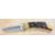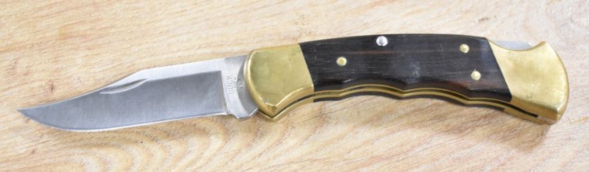 BUCK U.S.A. Model 112 Buck 'farmers knife' 8cm locking blade with two piece rosewood handle and brass bolster, 18.5cm overall, in its 13cm original light brown leather case with press-stud fastening. Sold together with a WW1 Memorial Plaque UNNAMED cast copy - looks similar to, but weighs less than, an original MP, ideal as a 'gap-filler' and a ring-finger measuring tool.(3) Buyer must be aged 18 or over and show proof of identity, thank you.