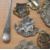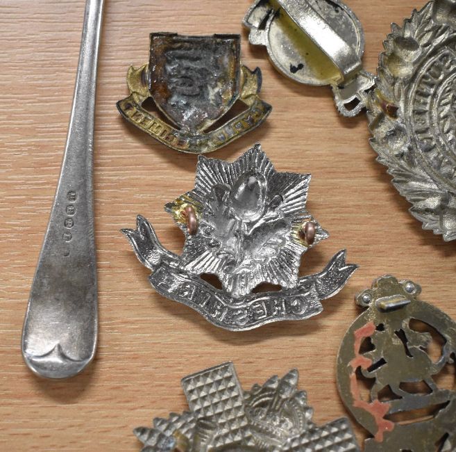 Military buttons and badges including Cyprus Regiment, Parachute Regiment, The Cambridgeshire Regt, Army Catering Corps and others, sold together with a hallmarked silver dessert spoon for the Tank Corps and bearing their 'Fear Naught' crest all contained in a McDowells tin, some backing residue, copies/replicas seen.(22)