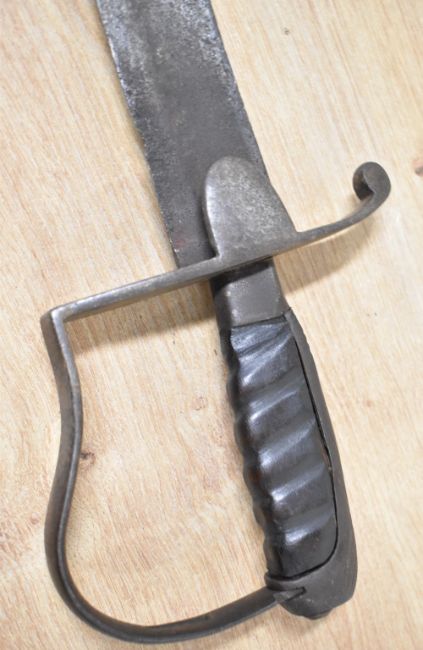 Cavalry sabre/sword, thought to be late Georgian-period, possibly a Prussian Blucher-style rather than a British cavalry sabre, single-edged broad fullered curved 77cm blade, this pitted, rusted and with damage to point and near hilt, metal D-shaped handle, metal crossguard, cross-hatched pommel with wooden grip, no makers marks seen throughout, without scabbard, worn condition, 90cm overall.(1) Buyer must be aged 18 or over and show proof of identity, thank you.