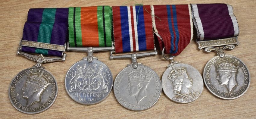 Family medals to SALES, believed to be Father and Son, comprising General Service Medal 1918-62 with clasp for PALESTINE and correctly impressed to 1858369. SPR. P.O. SALES. R.E. World War Two Defence and War medals, 1953 Coronation medal, these three unnamed as issued, GVI Army Long Service and Good Conduct medal correctly impressed as above, the group of five mounted for wear on metal pin bar, the Defence medal having come detached. Online sources confirm the award of the GSM for pre-war Palestine as Sapper W/Cpl for service with the 26th Field Company Royal Engineers between 1936 and 1939. During WW2, this Unit served with the 1st Infantry Division between 3 September 1939 and 28 February 1940 when it joined the 51st (Highland) Division. On 12 June 1940 the Company was captured with the Division at St. Valery-en-Caux. The award of the 1953 Coronation medal is supported by an original certificate from Buckingham Palace named to 22211630 Sergeant P.O. Sales. R.E. Sold together with an unnamed 'sole entitlement' United Nations medal for Korea, mounted for wear, four related Army sports medals dated between 1950 and 1959, one being hallmarked silver in its James Walker London Jeweller box of issue, a small King's Crown Royal Engineers button, a King's Crown Royal Engineers pin badge, a Royal British Legion pin badge, two Border Regiment cap badges, two 'flaming grenade' badges, an embossed cigarette case from Korea and several photographs and prints, featuring some scenes from Palestine and later. The vendor has confirmed that the medals were awarded to PHILLIP SALES, who served in Palestine, throughout WW2 and beyond and his son FREDERICK WALTER SALES, who served as a National Serviceman in Korea after hostilities had ceased and later on Crab and Christmas Island in 1956/57 whilst UK Atmospheric Nuclear Tests were being carried out and who would therefore, almost certainly, be entitled to receive the NUCLEAR TEST MEDAL, authorised by the UK Government retrospectively in 2023.(Lot) See also previous lot to JOHN SALES and following lot to CHRISTOPHER BOND.