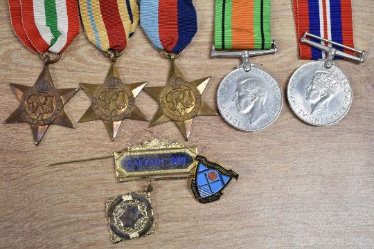 WW2 medals 1939-1945, Africa, Italy stars, Defence and War medals all with ribbons and unnamed as originally issued. Sold together with bronze-coloured medallion for Queen Victoria. Duke of Lancaster. Queen of Great Britain & Ireland In Commemoration of the Fiftieth Year of Her Majesty's Reign. 21st June 1887 with Queen's head on the obverse and having City of Lancaster's coat of arms on either side of the Castle gates above Lancaster and T. Storey. Mayor on reverse in its John Pinches Medallist of London box of issue, an Honorary Member Heysham Golf Club pin badge and Captain 1980 badge engraved for HGC. All contained in ornate patterned leather-covered wooden box 23cm x 4.5cm x 2.5cm overall.(8)