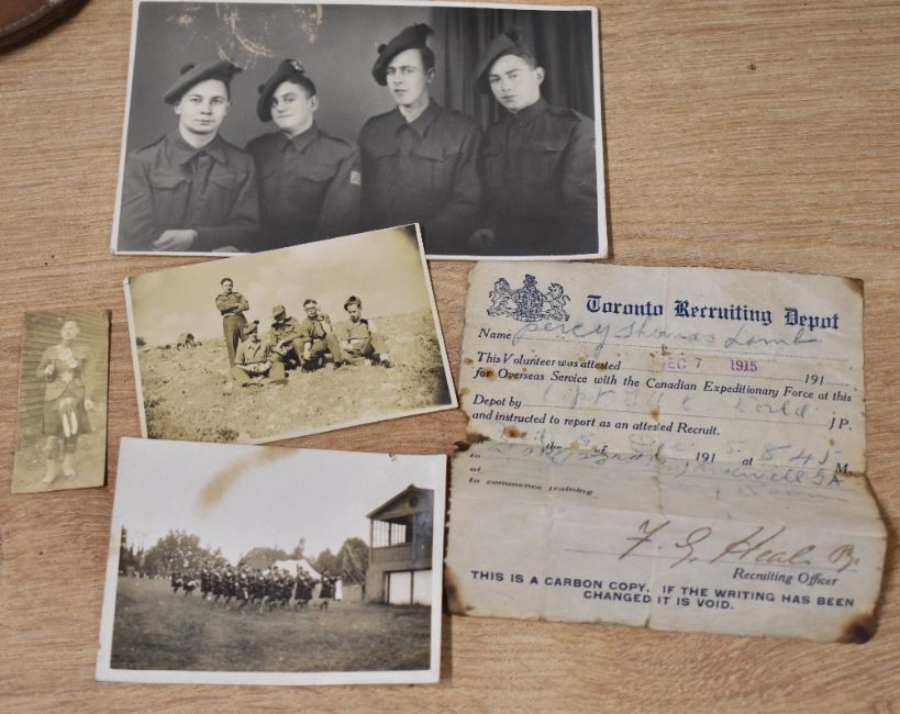 CANADA 48th Highlanders 134th Overseas Battalion dark brown leather cross belt fitted with white metal, possibly pewter, buckle, end mount and retaining clip, this scratched to rear P T LAMB 134 and a dark brown leather kilt belt fitted with white metal, possibly pewter, buckle with central figure of St. Andrew holding a cross or saltire, the leather of both belts in reasonable condition for age, a Toronto Recruiting Depot carbon copy chit for Overseas Service with CEF dated 7 December 1915 named to Percy Thomas LAMB, four small related photographs, one of which - it is assumed - depicts Lamb in uniform and wearing both of these belts. Online sources confirm that 799256 Percy Thomas LAMB was born 26 December 1890 in Allithwaite, Cumbria and was living in Toronto when he enlisted in 1915. His service records are available to download at Library and Archives Canada. Sold together with a brown leather cross belt with frog attachment and a Roberts of Sheffield Bushman's Friend hunting knife, the 13cm blade badly rusted, in leather sheath with clip fastening, 24cm overall.(9) Buyers must be aged 18 or over and show proof of identity, thank you.