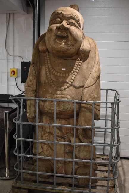 An impressive and monumental Chinese carved wooden Budai/laughing Buddha figure, modelled holding a gourd vessel and with sack across his back 215cm high Budai MythlokBudai, often called the 'Laughing Buddha,' was a 10th-century Chinese Chan Buddhist monk whose nickname means 'cloth sack,' referring to the bag he carried. He is a popular figure known for his cheerful, smiling face, large belly, and carefree demeanour, and is considered by many to be an incarnation of the future Buddha, Maitreya. While not the historical Buddha, he is associated with joy, happiness, generosity, and protection.
