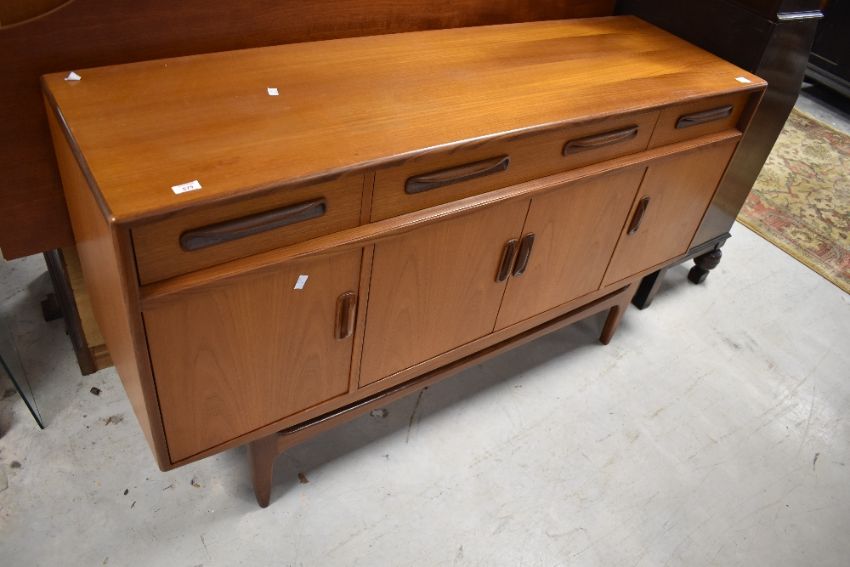 A vintage teak G plan or similar teak sideboard having stylised handles and legs, width approx. 152cm