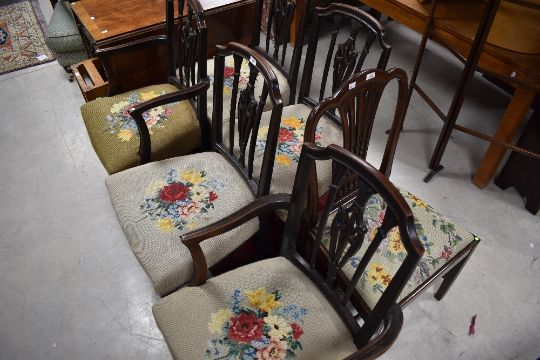A group of five George III mahogany dining chairs, 4+1 carver, each with shaped top rail and carved and pierced urn form splat and vertical bars, the padded needlework seats raised on butterfly moulded front supports, linked by stretchers 45cm