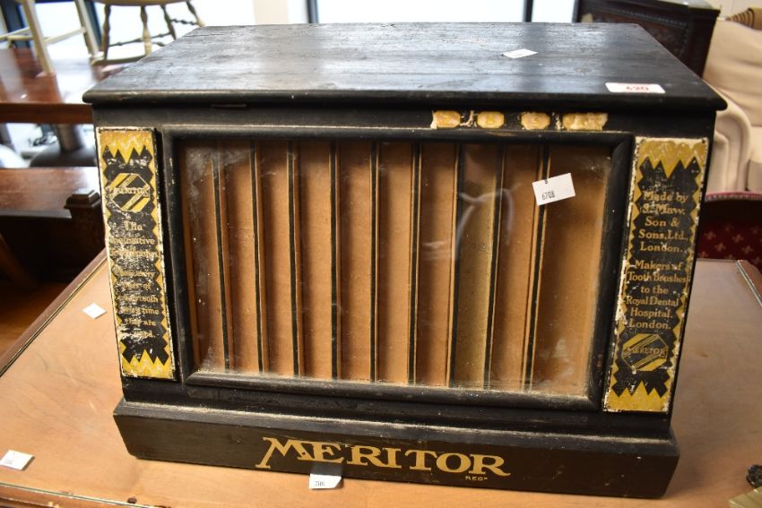 A vintage shop counter display , dentistry related, for Meritor toothbrushes, having glazed display section to front, with multi drawer to reverse side containing various pharmacy labels, dimensions approx. W45 H30cm
