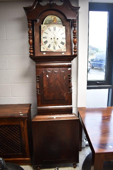 A 19th Century mahogany long cased clock having 8 day movement and painted arch dial with roman numerals and subsidiary dials, named for J C Elliott , Leeds, broken glass and door