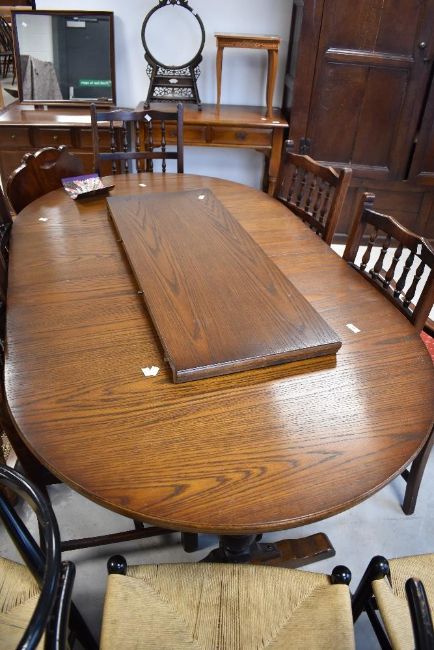 A vintage oak oval extending dining table and set of six (four plus two) dining chairs, approx. 165 x 96cm (extra leaf 38cm)
